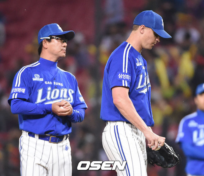 16일 오후 광주 KIA 챔피언스필드에서 열린 '2014 한국야쿠르트 세븐 프로야구' KIA 타이거즈와 삼성 라이온즈 경기,삼성 선발 마틴이 7회말 1사 1,2루 상황에서 마운드를 내려오고 있다.