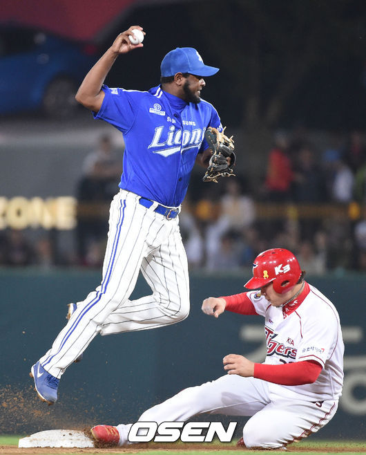 16일 오후 광주 KIA 챔피언스필드에서 열린 '2014 한국야쿠르트 세븐 프로야구' KIA 타이거즈와 삼성 라이온즈 경기,7회말 1사 1,2루 이종환의 내야땅볼때 삼성 나바로가 1루주자 김주형을 2루에서 포스아웃 시키고 있다.