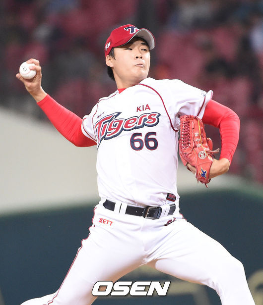 16일 오후 광주 KIA 챔피언스필드에서 열린 '2014 한국야쿠르트 세븐 프로야구' KIA 타이거즈와 삼성 라이온즈 경기,8회초 KIA 한승혁이 팀 두번째 투수로 등판 공을 뿌리고 있다.