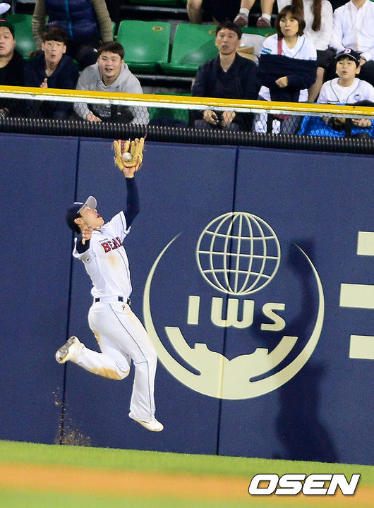 6회초 1사 1,3루에서 NC 테임즈의 타구를 두산 민병헌이 몸 날려 잡아 내고 있다.