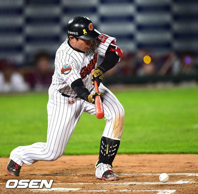 16일 오후 부산 사직구장에서 열린 2014 한국야쿠르트 세븐 프로야구 롯데 자이언츠와 넥센 히어로즈의 경기,6회말 무사 2루 롯데 황재균이 희생번트를 시도하고 있다. 이후 투수의 송구실책으로 2루 주자 박종윤이 홈까지 들어와 동점.