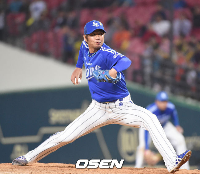 16일 오후 광주 KIA 챔피언스필드에서 열린 '2014 한국야쿠르트 세븐 프로야구' KIA 타이거즈와 삼성 라이온즈 경기,8회말 2사 1,3루 김주형 타석때 삼성 임창용이 등판 공을 뿌리고 있다.