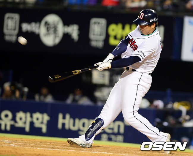 7회말 무사 1루에서 두산 김현수가 투런포를 날리고 있다.