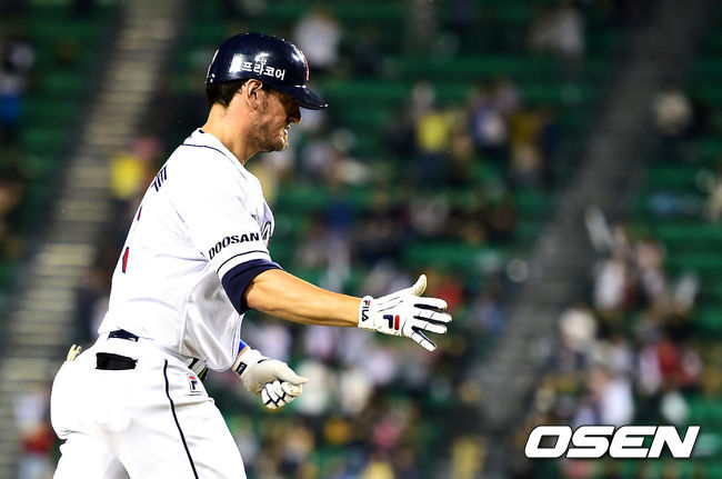 7회말 무사에서 두산 칸투가 김현수에 이어 솔로포를 날리고 그라운드를 돌고 있다.