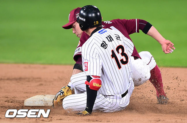 16일 오후 부산 사직구장에서 열린 2014 한국야쿠르트 세븐 프로야구 롯데 자이언츠와 넥센 히어로즈의 경기, 8회말 롯데 선두타자 황재균이 안타를 날린뒤 2루에서 넥센 서건창 2루수에게 태그아웃되고 있다.
