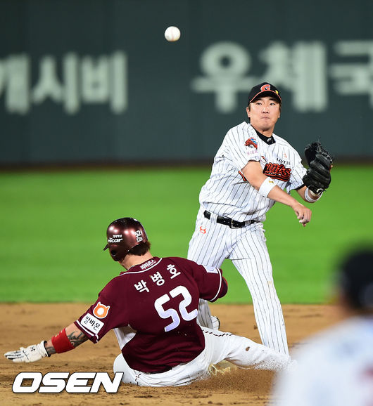 9회초 무사 1,2루 넥센 강정호의 병살타때 롯데 정훈 2루수가 1루 주자 박병호를 포스아웃 시킨뒤 1루로 송구하고 있다. / soul1014@osen.co.kr