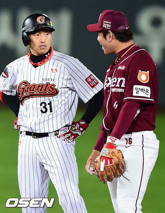 5회말 1사 만루 롯데 손아섭의 1타점 적시타때 2루 주자 신본기가 홈에서 아웃되자 넥센 강정호 2루수가 손아섭을 약올리며 장난치는 모습이 포착됐다.
