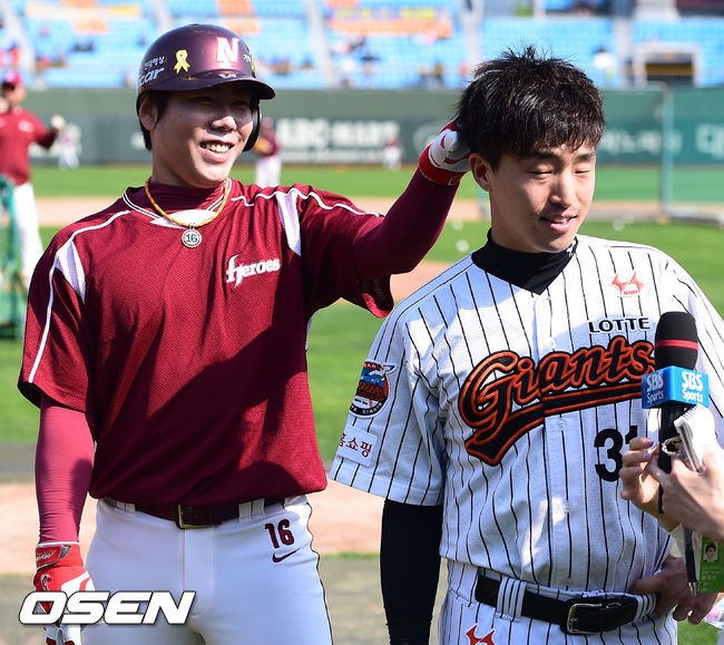 17일 오후 부산 사직구장에서 열린 2014 한국야쿠르트 세븐 프로야구 롯데 자이언츠와 넥센 히어로즈의 경기전 넥센 강정호가 인터뷰 하던 롯데 손아섭에게 다가와 장난을 치고 있다.