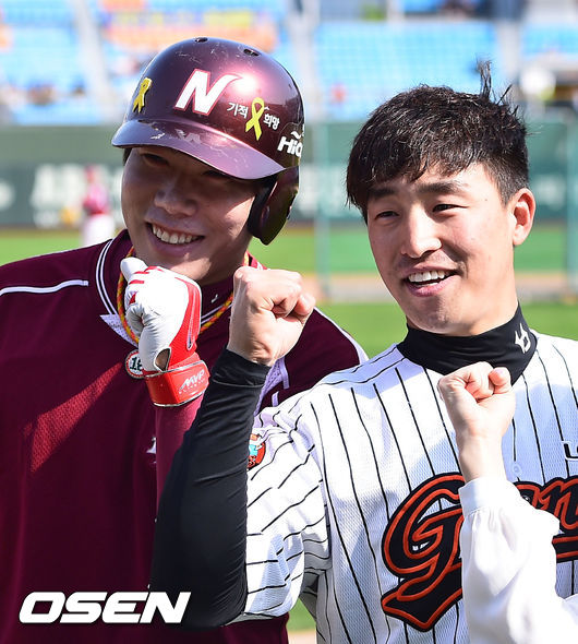 17일 오후 부산 사직구장에서 열린 2014 한국야쿠르트 세븐 프로야구 롯데 자이언츠와 넥센 히어로즈의 경기전 넥센 강정호와 롯데 손아섭이 인터뷰를 하며 포즈를 취하고 있다.