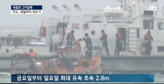 기상청에 따르면 진도 해역은 바람이 약하고 파도도 1미터 미만으로 잔잔한편이지만, 내일까지 대조기가 계속돼 유속이 초속 2.8미터에 달할 것으로 예상된다. 사고 해역 주변에는 와류와 소용돌이가 형성되는 등 조류가 불규칙해 수중 작업을 하는데 있어서 최악의 조건이 될 전망이다.