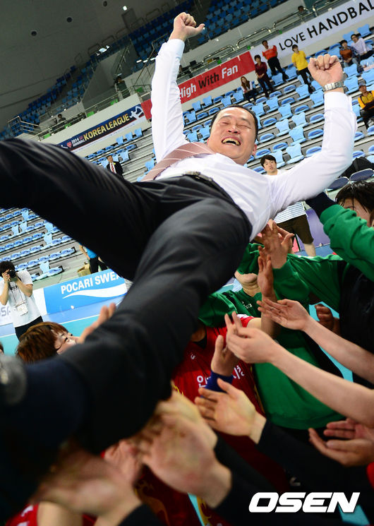 우승을 차지한 인천시청 조한준 감독이 선수들에게 헹가래를 받고 있다./youngrae@osen.co.kr