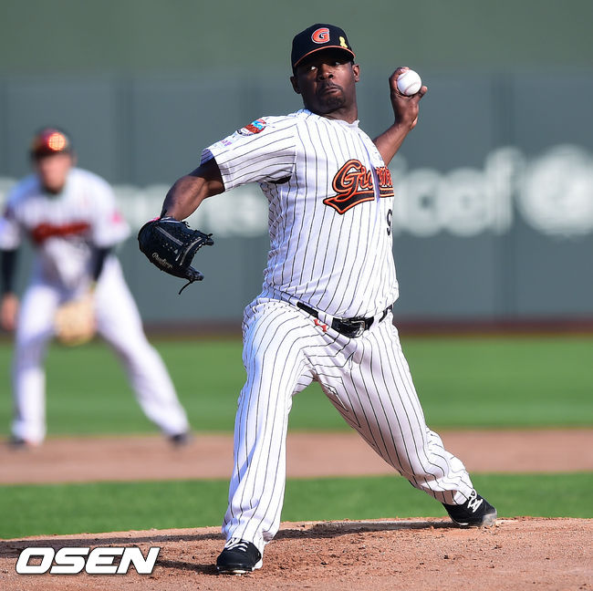17일 오후 부산 사직구장에서 열린 2014 한국야쿠르트 세븐 프로야구 롯데 자이언츠와 넥센 히어로즈의 경기, 1회초 롯데 선발투수 유먼이 역투하고 있다.