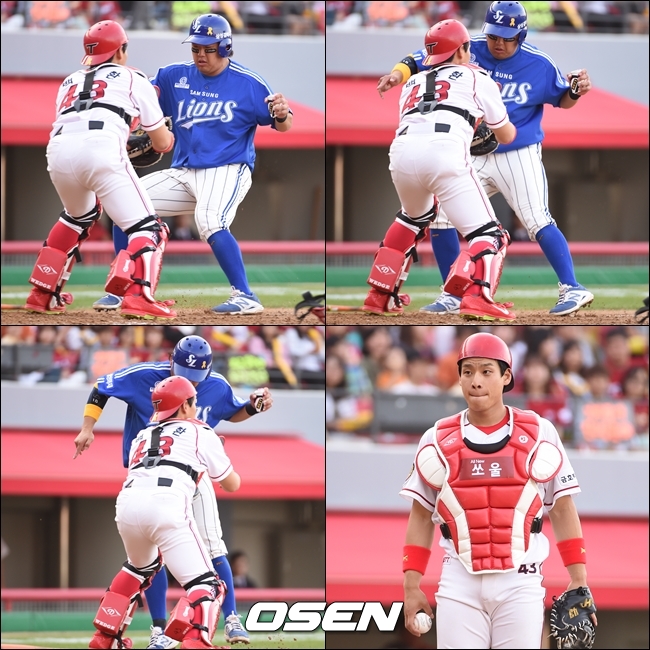 17일 오후 광주 KIA 챔피언스필드에서 열린 '2014 한국야쿠르트 세븐 프로야구' KIA 타이거즈와 삼성 라이온즈 경기,3회초 1사 2,3루 이흥련의 내야땅볼때 3루주자 박석민 KIA 백용환 포수의 태그를 피하며 재치있는 주루 플레이로 홈에서 득점을 올리고 있다.