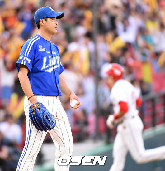 17일 오후 광주 KIA 챔피언스필드에서 열린 '2014 한국야쿠르트 세븐 프로야구' KIA 타이거즈와 삼성 라이온즈 경기,3회말 1사 1,3루 삼성 선발 장원삼이 필에게 스리런 홈런을 허용하며 아쉬워하고 있다.
