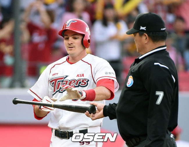17일 오후 광주 KIA 챔피언스필드에서 열린 '2014 한국야쿠르트 세븐 프로야구' KIA 타이거즈와 삼성 라이온즈 경기,3회말 1사 1,3루 필 스리런 홈런을 날리고 홈인 문승훈 구심으로 부터 방망이를 전달받고 있다.