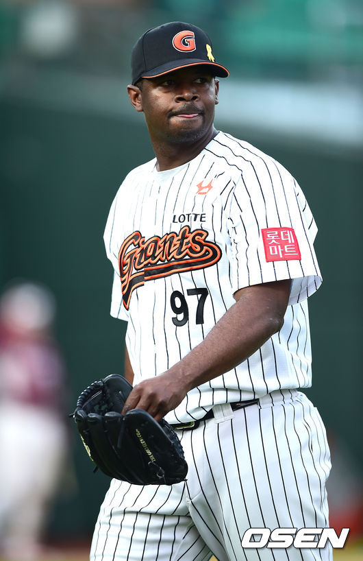 17일 오후 부산 사직구장에서 열린 2014 한국야쿠르트 세븐 프로야구 롯데 자이언츠와 넥센 히어로즈의 경기,6회초 1사 만루에서 롯데 선발투수 유먼이 강판되고 있다. 유먼은 이날 5⅓이닝 10실점하며 시즌 첫 패전 위기를 맞았다.