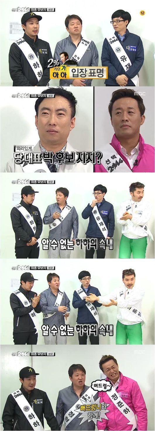 일단 하하는 후보 탈퇴와 함께 정형돈을 지지했다. 박명수는 유재석의 선출을 막겠다는 공언을 철회하고 유재석을 지지하며 후보 탈퇴를 선언했다. 박명수는 사생활 공유 공약을 내건 노홍철을 언급하며 “미친 친구한테 맡길 수 없다”고 말했다.