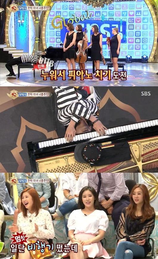 민혁은 17일 오후 방송된 SBS 예능프로그램 '놀라운 대회 스타킹'에서 독일에서 온 코믹 미녀 4중주단을 따라 누워서 피아노를 연주해보였다.