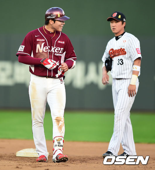 17일 오후 부산 사직구장에서 열린 2014 한국야쿠르트 세븐 프로야구 롯데 자이언츠와 넥센 히어로즈의 경기,6회초 1사 만루 넥센 강정호가 2타점 적시타를 날린후 손아섭을 향해 미소 짓고 있다. 강정호와 손아섭은 전날 경기에서 장난치는 모습이 카메라에 잡히면서 큰 화제가 되었다.