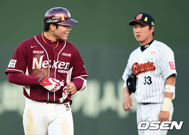 17일 오후 부산 사직구장에서 열린 2014 한국야쿠르트 세븐 프로야구 롯데 자이언츠와 넥센 히어로즈의 경기,6회초 1사 만루 넥센 강정호가 2타점 적시타를 날린후 손아섭을 향해 미소 짓고 있다. 강정호와 손아섭은 전날 경기에서 장난치는 모습이 카메라에 잡히면서 큰 화제가 되었다.
