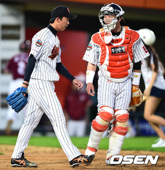 17일 오후 부산 사직구장에서 열린 2014 한국야쿠르트 세븐 프로야구 롯데 자이언츠와 넥센 히어로즈의 경기,7회초 롯데 김유영 투수가 넥신 박병호에게 1타점 적시타를 허용한 후 용덕한 포수의 격려를 받고 있다. 김유영은 작년 롯데 신인1차지명으로 뽑힌 기대주로 지난 13일 프로무대 첫 등판을 했다.