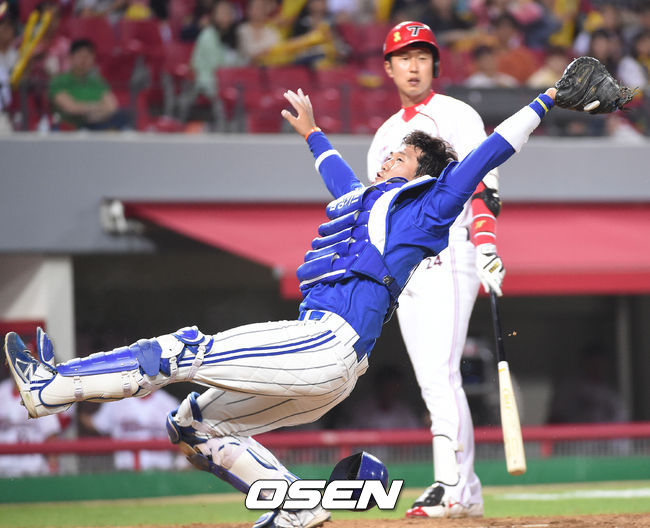 17일 오후 광주 KIA 챔피언스필드에서 열린 '2014 한국야쿠르트 세븐 프로야구' KIA 타이거즈와 삼성 라이온즈 경기,7회말 무사 1루 김다원의 포수 근처 플라이 타구때 삼성 이흥련 포수가 아웃처리 시키고 있다.