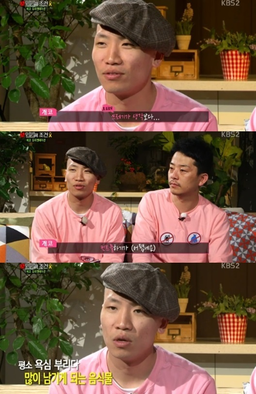 이날 김준호와 멘토, 멘티 한 팀으로 뭉친 개코는 미션 체험 첫 날을 보낸 후 "쓰레기를 컨트롤 하기가 어려웠다"고 소감을 전했다.
