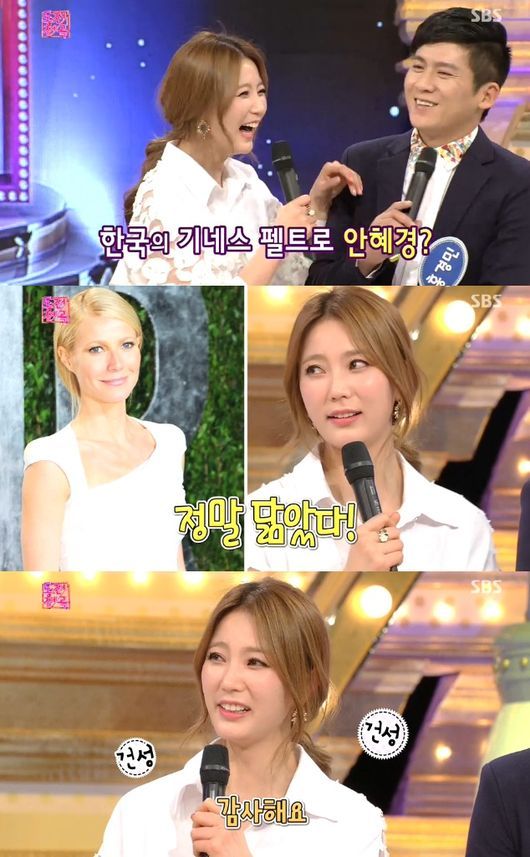 MC 이휘재가 "정말 예뻐졌다"며 "작가들이 기네스 팰트로 닮았다고 하더라"라고 계속 칭찬했고 안혜경은 영혼 없는 목소리로 "감사하다"고 말해 웃음을 자아냈다.