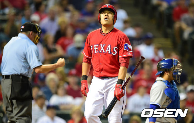 18일(이하 한국시간) 미국 텍사스주 알링턴 글로브 라이프 파크에서 열린 '2014 메이저리그' 텍사스 레인저스와 토론토 블루제이스의 경기 4회말 선두타자 추심수가 삼진을 당하고 아쉬워 하고 있다.