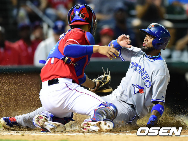 18일(이하 한국시간) 미국 텍사스주 알링턴 글로브 라이프 파크에서 열린 '2014 메이저리그' 텍사스 레인저스와 토론토 블루제이스의 경기 5회초 1사 1,3루 엔카나시온의 외야플라이에 3루주자 레예스가 홈으로 쇄도, 태그아웃 당하고 있다.