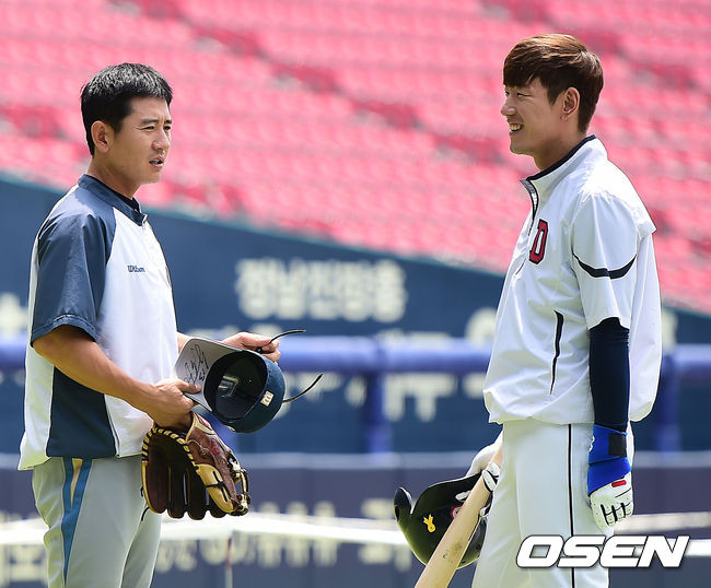 18일 오후 서울 잠실야구장에서 열리는 '2014 한국야쿠르트 세븐 프로야구' 두산 베어스와 NC 다이노스의 경기에 앞서 NC 손시헌이 두산 김재호와 이야기를 나누고 있다.