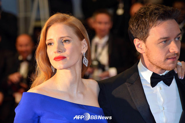 [OSEN=사진팀] 17일(현지시간) 프랑스 칸에서 세계 최고의 국제영화제인 '제 67회 칸영화제'가 열린 가운데 배우 제시카 차스테인과 제임스 맥어보이가 영화 '와일드 테일즈' 시사회에 참석해 포즈를 취하고 있다.