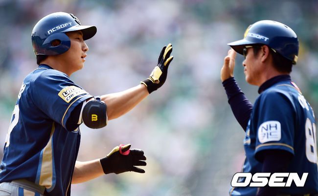 4회초 선두타자로 나선 NC 나성범이 솔로 홈런을 때린 뒤 이광길 코치와 하이파이브를 하고 있다.