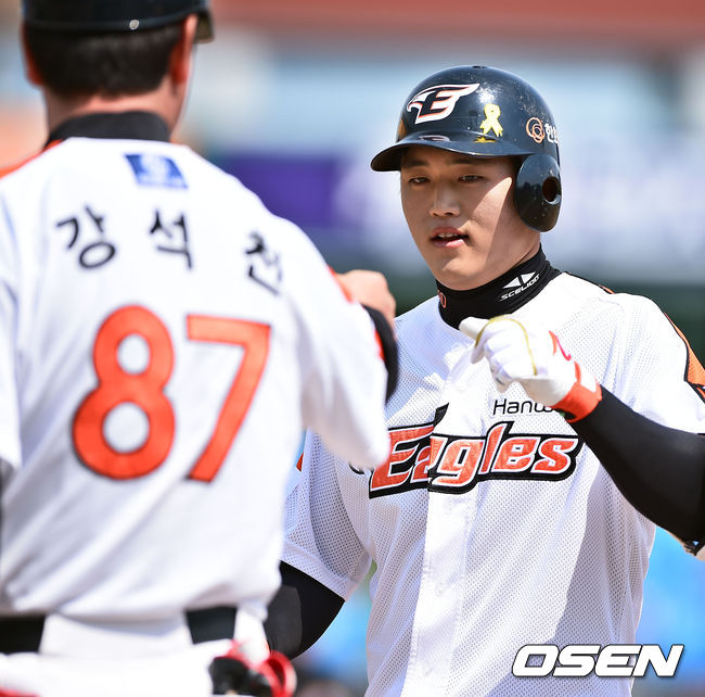 18일 오후 대전구장에서 열린 2014 한국야쿠르트 세븐 프로야구 한화 이글스와 SK 와이번스의 경기,3회말 한화 선두타자 장운호가 안타를 날리고 강석천 코치와 하이파이브를 하고 있다.