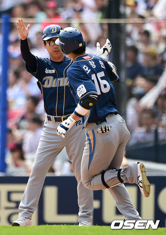 4회초 무사 1,3루 NC 모창민이 두산 노경은을 상대로 좌측담장을 넘기는 스리런 홈런을 때린 뒤 전준호 코치와 하아파이브를 하고 있다.