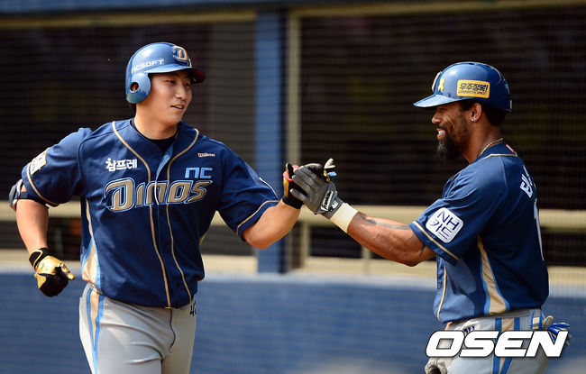4회초 무사 NC 나성범이 솔로 홈런을 때린 뒤 테임즈와 하이파이브를 하고 있다.