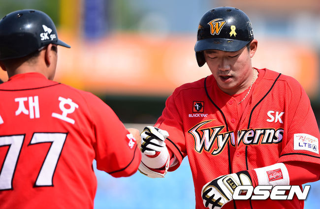 18일 오후 대전구장에서 열린 2014 한국야쿠르트 세븐 프로야구 한화 이글스와 SK 와이번스의 경기,5회초 1사 1,2루 SK 홍명찬이 동점 1타점 적시타를 날리고 백재호 코치와 하이파이브를 하고 있다.