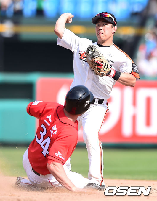 18일 오후 대전구장에서 열린 2014 한국야쿠르트 세븐 프로야구 한화 이글스와 SK 와이번스의 경기,6회초 1사 1,3루 SK 나주환의 병살타때 한화 정근우 2루수 1루 주자 스캇을 포스아웃 시킨뒤 1루로 송구하고 있다.