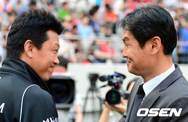 경기에 앞서 성남 이상윤 감독과 서울 최용수 감독이 인사를 나누고 있다.