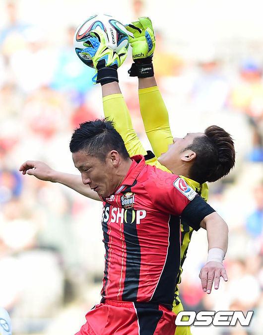 전반 서울 김진규와 성남 골키퍼 박준혁이 코너킥 상황에서 공중볼 다툼을 하고 있다.