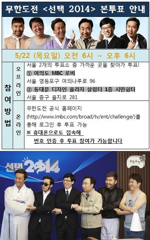 한편 '무한도전'의 사전 투표는 전국 10개 도시, 11개 투표소에서 사전 투표일 이틀간 오전 6시부터 오후 6시까지 진행됐다. 제작진은 투표와 함께 출구 조사를 진행했으며 결과는 22일 본 투표 당일 6시 투표 종료 시점, 멤버들에게 공개될 예정이다. 검표는 투표가 끝나는대로 중앙선거관리위원회 자동검표기와 무한도전선거관리위원회 인력들의 수검표로 동시에 진행될 예정이다.