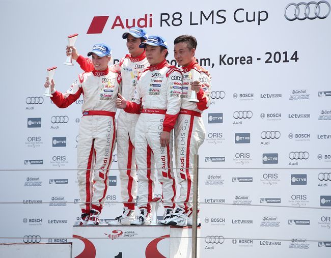 2라운드 경기 시상 후 포디움에 함께 오른 선수들. 좌측부터 라헬 프레이(2위), 알렉스 융(1위), 마치 리(3위), 유경욱(4위, 딜러임포터 부문 1위)./ 아우디 코리아 제공.