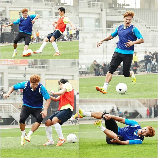 공개된 사진에는 김종국의 뼈아픈 '굴욕 수난사'가 담겨있다. 상대팀 골문을 향해 질풍 같은 드리블 돌파를 시도하던 김종국이 바람처럼 달려온 이영표에 의해 1초 만에 저지당하고 만 것. 그라운드에 힘없이 패대기 쳐지는 김종국의 모습이 웃음을 자아낸다.