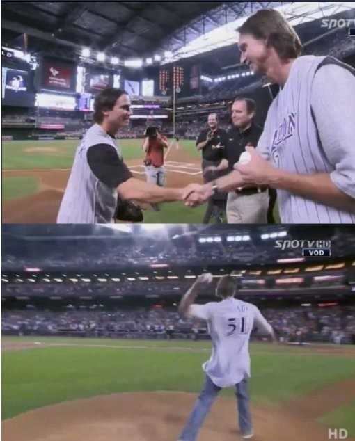 존슨은 19일(이하 한국시간) 미국 애리조나주 피닉스 체이스 필드에서 벌어진 LA 다저스전에 앞서 시구를 했다. 정확하게 10년 전 있었던 퍼펙트게임을 기념한 시구였다.