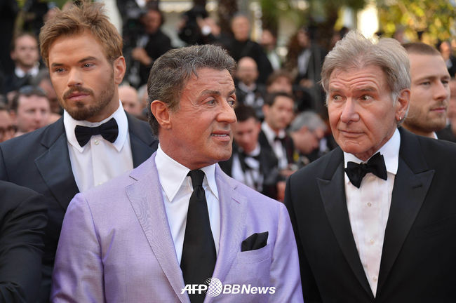 [OSEN=사진팀] 18일(현지시간) 프랑스 칸에서 세계 최고의 국제영화제인 '제 67회 칸영화제'가 열린 가운데 배우 켈란 루츠, 실베스터 스탤론(68), 해리슨 포드(72)가 영화 '익스펜터블 3' 레드카펫 행사에 참석해 포즈를 취하고 있다.