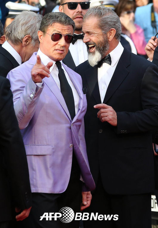 [OSEN=사진팀] 18일(현지시간) 프랑스 칸에서 세계 최고의 국제영화제인 '제 67회 칸영화제'가 열린 가운데 배우 실베스터 스탤론(68)과 멜 깁슨(58)이 영화 '익스펜터블 3' 레드카펫 행사에 참석해 포즈를 취하고 있다.