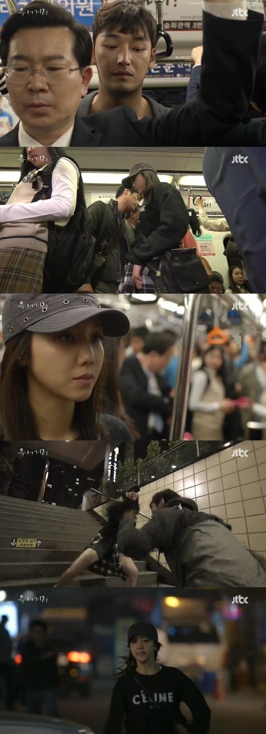 19일 방송된 JTBC 월화드라마 '유나의 거리'(극본 김운경, 연출 임태우) 1회분에서는 유나(김옥빈 분)가 지하철에서 소매치기들이 훔친 지갑을 다시 자신이 훔쳐 도망가는 내용이 그려졌다.