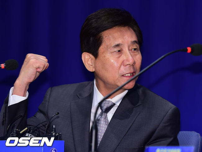 20일 오후 경기도 파주시 파주 NFC(대표팀 트레이닝센터)에서 열린 역대 축구대표팀 감독 오찬모임에서 김정남 전 축구대표팀 감독이 응원을 하고 있다.