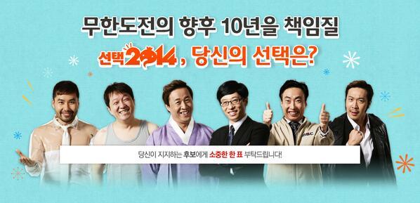 MBC 방송프로그램 홍보 트위터 위드MBC(withMBC)는 20일 오후 "'무한도전 선택 2014' 본투표를 위한 페이지가 열렸습니다! 5월 22일 목요일 서울 두 곳에서 열릴 오프라인 투표소도 확인하세요!"라는 글을 게재해 본투표에 대한 기대감을 높였다.