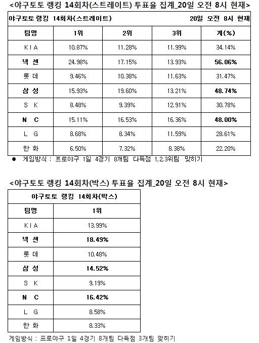 국민체육진흥공단(www.kspo.or.kr)이 발행하는 체육진흥투표권 수탁사업자인 스포츠토토 공식발매사이트인 베트맨(www.betman.co.kr)은 21일 열리는 넥센-한화, KIA-LG, NC-SK, 삼성-롯데 등 4경기 8개팀을 대상으로 한 야구토토 랭킹 14회차 스트레이트 게임 중간집계결과 넥센(56.06%), 삼성(48.74%), NC(48.00%)가 차례로 다득점 상위 3개팀으로 꼽았다고 밝혔다. 반면 LG와 한화는 각각 28.61%와 22.20%를 득표해 가장 적은 득점을 기록할 것으로 예상했다.
